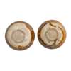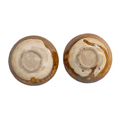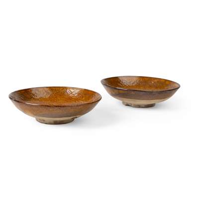 each with stepped sides, the interior with three small unglazed spur marks, mould-pressed with design of a chrysanthemum flower in the centre, encircled by a band of fish, further with brocade pattern below the mouth, covered with amber glaze suffused with brown streaks, stopped in the middle of the exterior, revealing the buff stoneware body