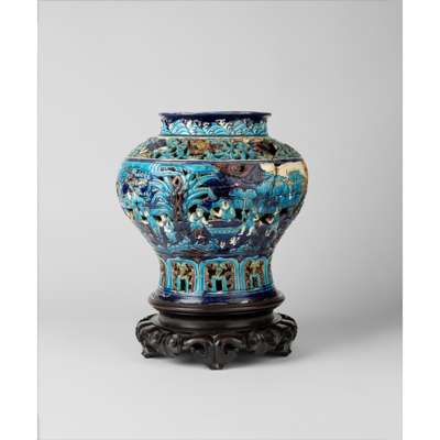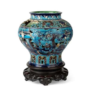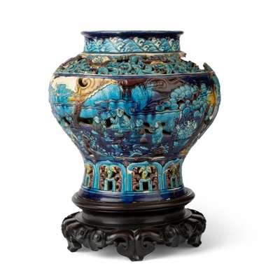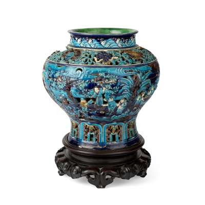 Note: Fahua, meaning designs with boundaries, is a term probably coined by connoisseurs in the 1920s, refers to a palette and style of ornament rather than a kiln site. Fahua-type wares are mostly ornamented with designs outlined in relief with brightly coloured lead-alkaline glazes from a distinctive palette. During the Ming dynasty, fahua ceramics tended to be rather large-scale, mostly vases, wine jars and garden seats. [1] The example offered here falls under the category of wine jar. For a related reticulated fahua wine jar, decorated with Eight Daoist Immortals, dated to the Ming dynasty, 16th century, is in the collection of the British Museum, museum no. 2003,0731.1. Also compare to other reticulated fahua wine jars decorated with figures, Ming dynasty, in auctions, two were offered at Sotheby's New York, 24 March 2018, lot 1542 and Sotheby's Hong Kong, 9 October 2020, lot 3616; one was sold at Christie's Hong Kong 19 Mar 2020, lot 103.