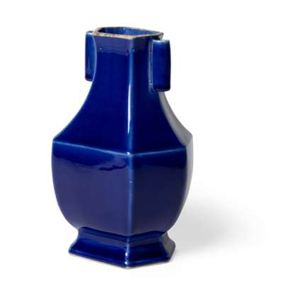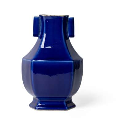 the faceted baluster body standing on a splayed foot and rising to a waisted neck flanked by a pair of tubular handles, applied overall with a dark blue glaze, saved for the foot rim left unglazed, the countersunk base inscribed with the six-character Daoguang mark in underglaze-blue