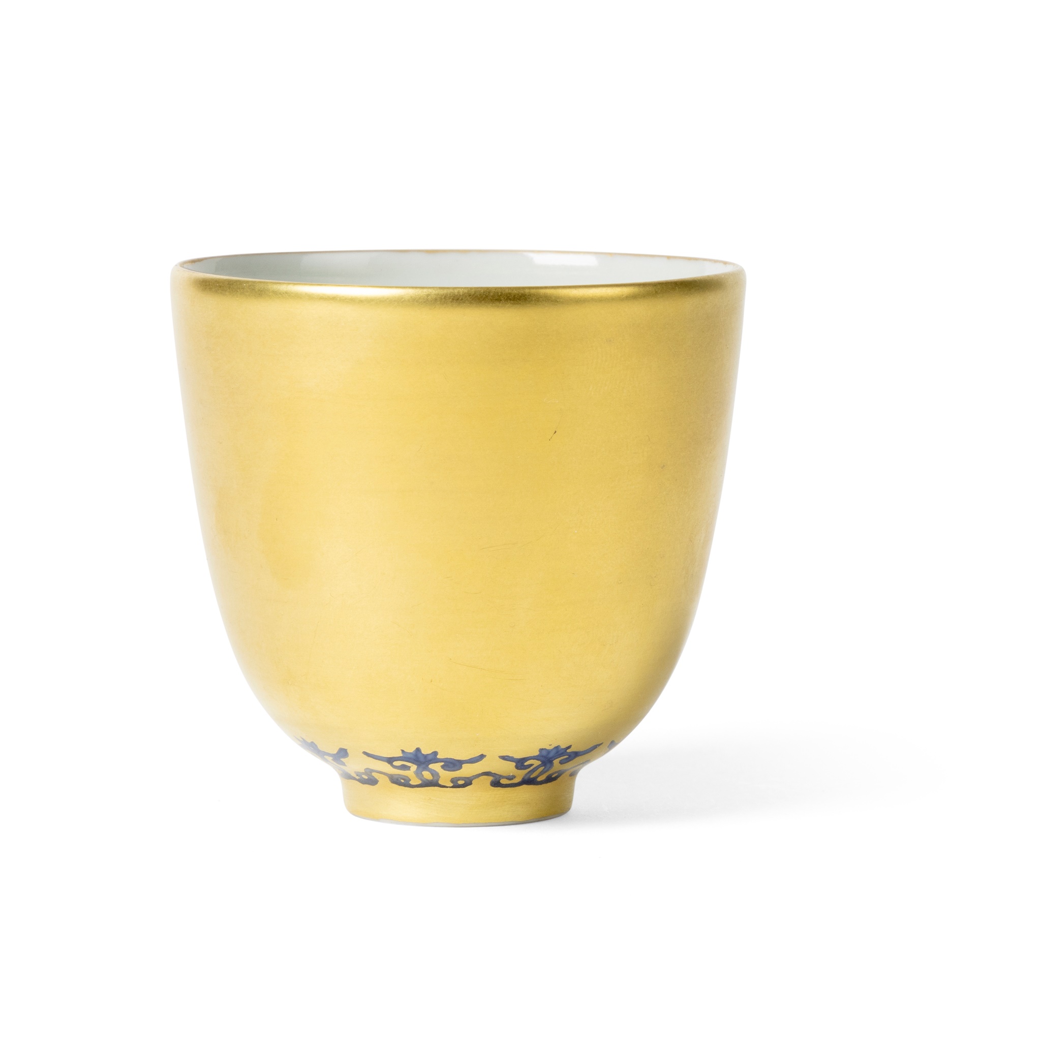 the steep body resting on a ring foot, covered on the exterior with a luscious golden glaze, above the foot with a reverse design of scrolling floral and foliage in underglaze blue, the base inscribed with a six-character Kangxi mark within double-circles in underglaze blue