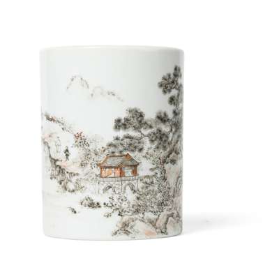 IRON-RED AND GRISAILLE-DECORATED 'LANDSCAPE' BRUSH POT