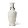 sturdily potted on high everted foot, raised to a tapered body, long waisted neck and flared mouth, two sides of the neck moulded with flowering prunus, raised branches as loop handles, the decoration covered in bronze glaze, against a creamy white ground suffused with a network of dark and russet crackles