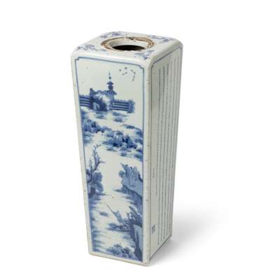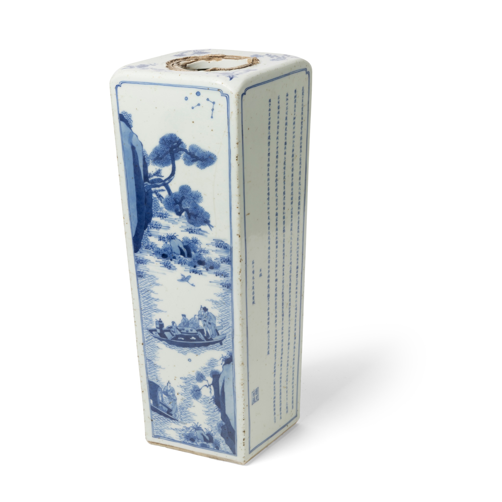 Note: Compare to a similar blue and white square-form vase, with similar composition of the design and painting, Kangxi mark and period, in the collection of the Metropolitan Museum, accession no. 2015.784.1
