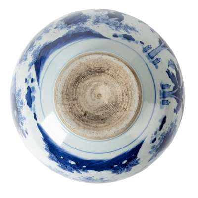 Note: Compare to a blue and white offering bowl of similar shape, painted with Bodhidharma, in the collection of the Palace Museum, Beijing, museum no. Xin 新00113565