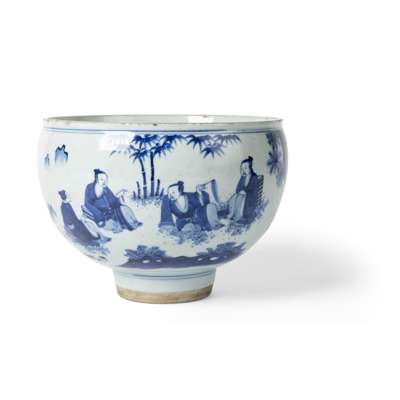 BLUE AND WHITE 'SEVEN SAGES' STEM BOWL