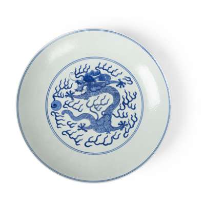the shallow rounded sides rising from a short foot to a wide mouth, painted to the interior with a five-clawed dragon writhing among flames pursuing a flaming pearl, the exterior similarly decorated with two striding dragons each chasing a flaming pearl, the base with a six-character Guangxu mark in underglaze blue