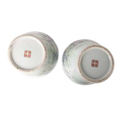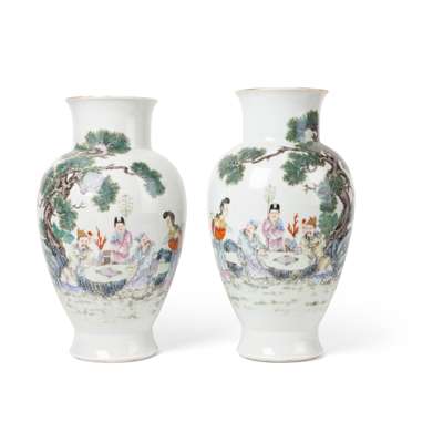each of baluster form, painted in mirror-images with a lady holding a rabbit looking over a male figure's shoulders of their chess game next to a gnarling pine tree, the base inscribed with a four-character Shende Tang Zhi mark with a square panel in iron-red
