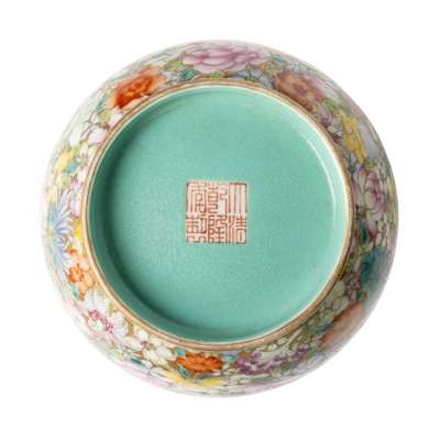 painted on two rounded cartouches with flowering plants frequented by birds and dragonfly, all against a dense millefleur ground, the base inscribed with a six-character Qianlong mark in iron-red on a turquoise ground