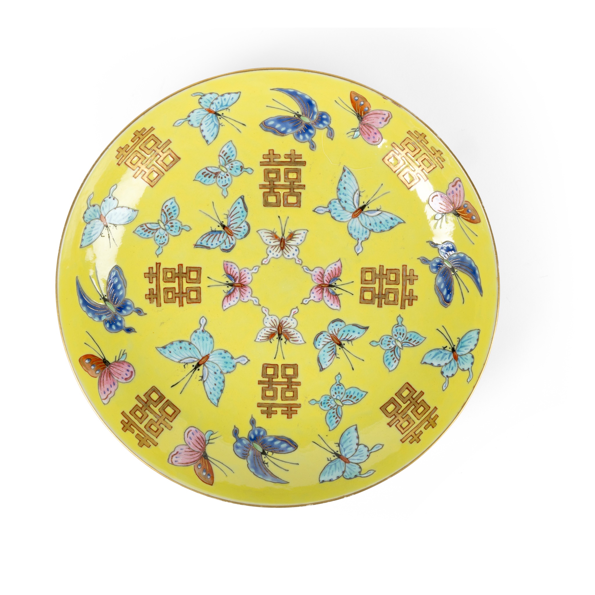 YELLOW-GROUND FAMILLE ROSE 'DOUBLE-HAPPINESS' DISH
