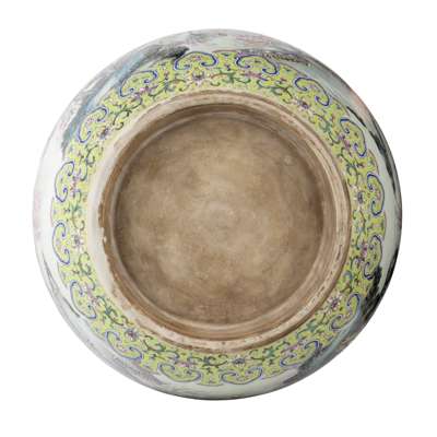 A larger vase comparable to the current lot, with similar shape, form and design of the decorations, including the arrangement of the ladies playing musical instruments and dancing, albeit with a ruby-red ground and the base inscribed with a Qianlong mark, dated to the period, was sold at Poly Beijing, 19 October 2020, lot 5071.