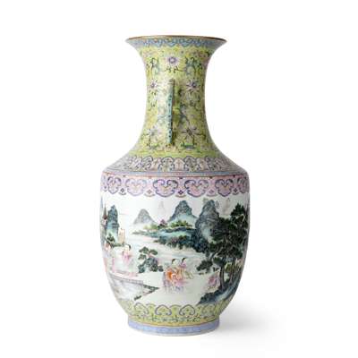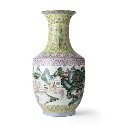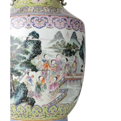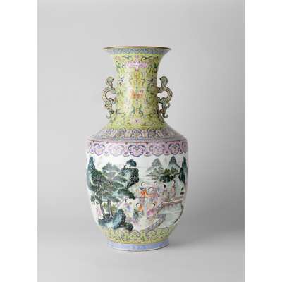 Note: The depiction of this vase is based on a Chinese idiom, gewu shengping, which means singing and dancing extolling peaceful times. In the Qing dynasty this subject matter can be seen painted on a vase of lantern form, Qianlong mark and period, previously in the Qing Court, now in the collection of the National Palace Museum, Taipei, museum no. Gu Ci 故瓷7371N.