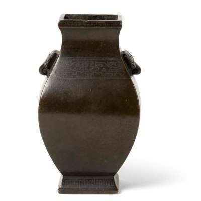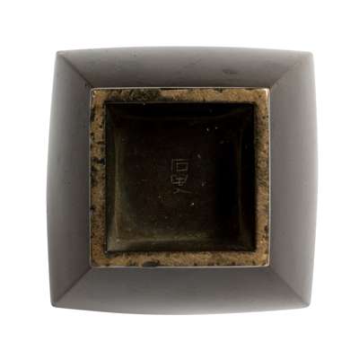 Note: Compare to a slightly bigger (13.3 cm high) silver-inlaid square-section bronze vase, attributed to Shi Sou and dated to the 17th-18th century, in the collection of the Metropolitan Museum of Art, accession number 2015.273. According to the catalogue, vases of this nature would have served as flower vases or for holding tongs and spatulas for the practice of incense burning. Also compare to a similar silver-inlaid bronze vase, fanghu, with Shi Sou mark and dated to the 17th-18th century, sold at Sotheby's Hong Kong, 7 Oct 2014, lot 3361.