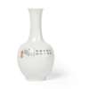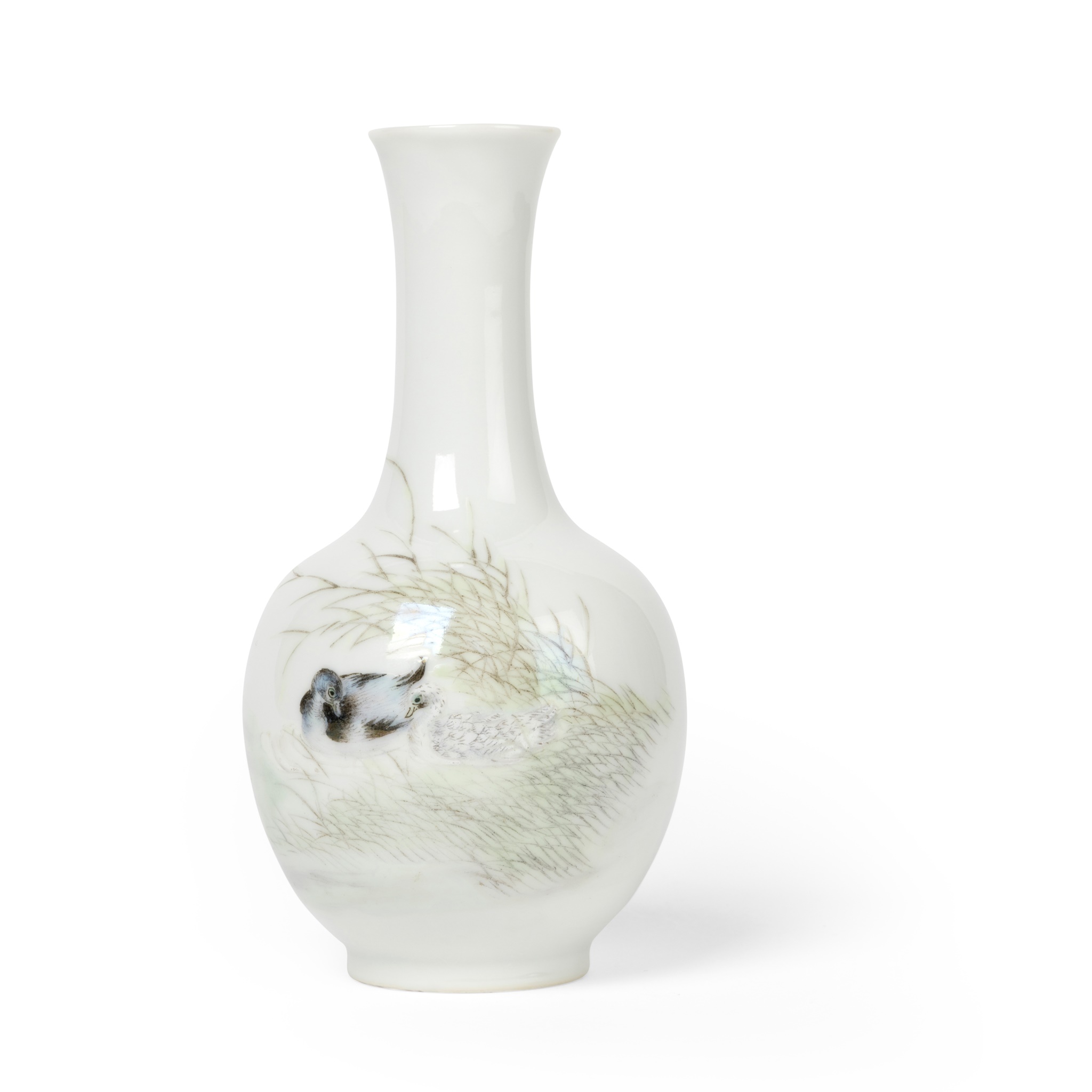 of bottle form with waisted neck and flared mouth, painted on one side with a pair of mandarin ducks in a pond, the reverse inscribed with a poem, dated to the spring of Jia Xu year, corresponding to 1934AD, signed 'Xu Ren', two red seals, the base further inscribed a four-character apocryphal Qianlong mark