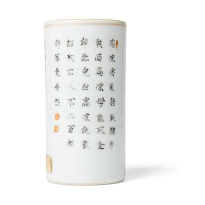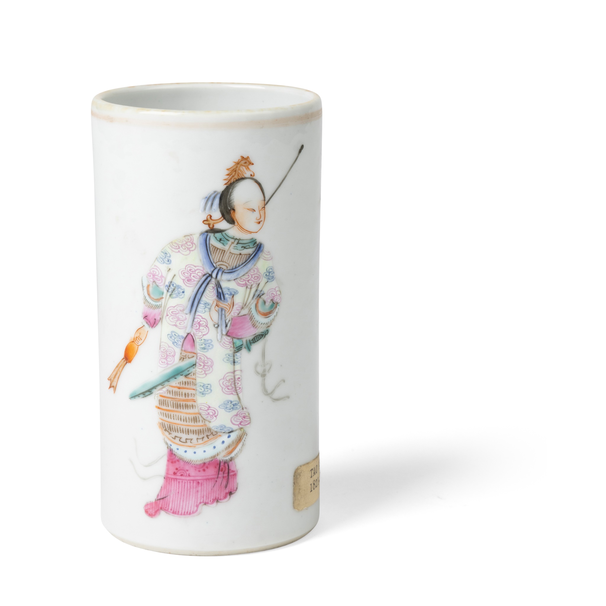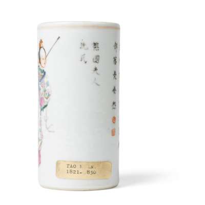 the exterior of the cylindrical body finely painted with Lady of Chiao Kuo, also known as Lady Xian, a Chinese historical figure in Wushuangpu, the reverse inscribed with her title and a corresponding poem, the recessed base inscribed with a six-character Daoguang mark in double squares in iron-red