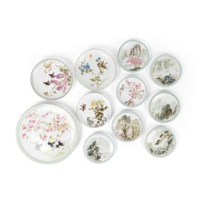 二十世紀 甫仁、桂英款 景德鎮製底款 各式粉彩山水花鳥圖盤(共十一件)