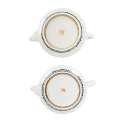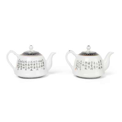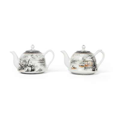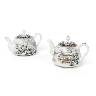 TWO GRISAILLE AND FAMILLE ROSE 'WINTER LANDSCAPE' TEAPOTS