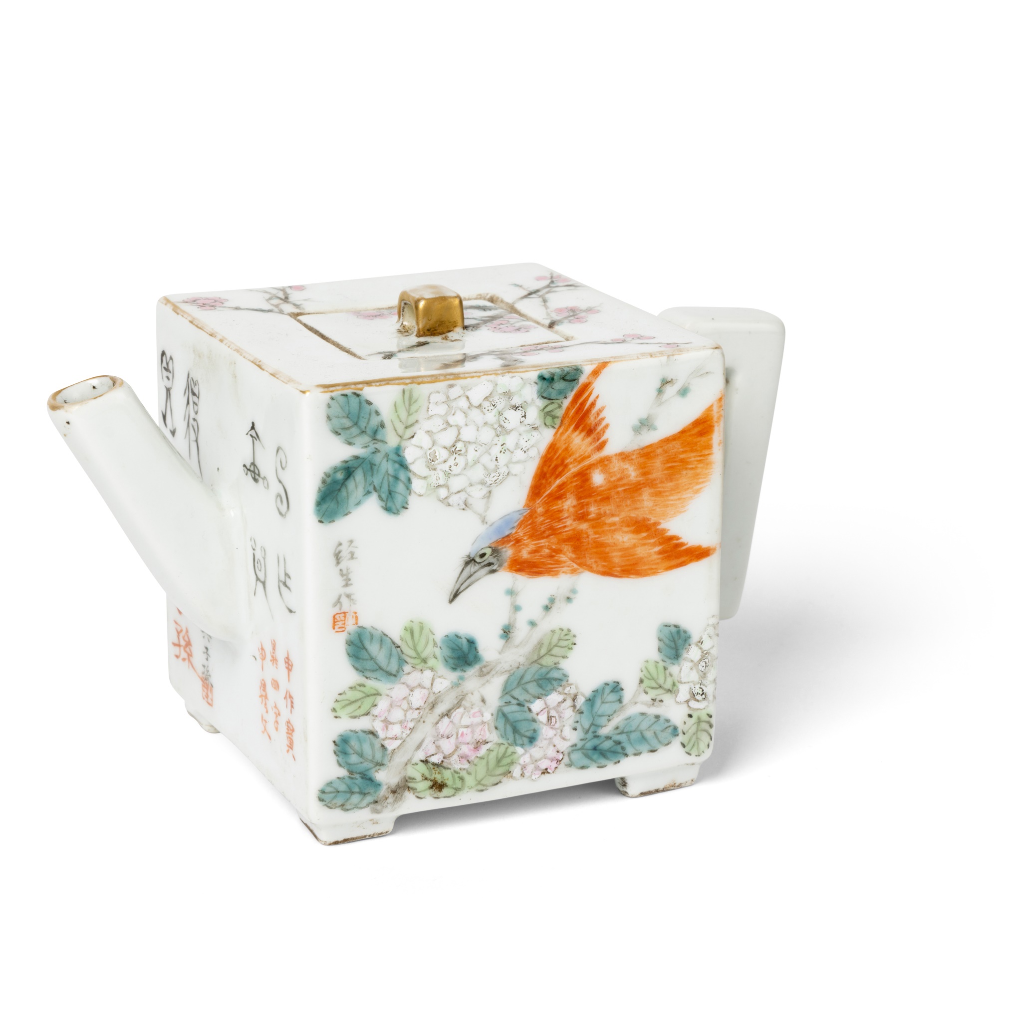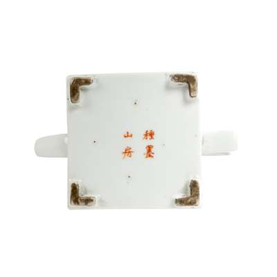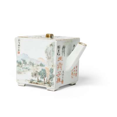rising from four bracket feet to straight sides and top, one side painted with a shanshui landscape signed 'Jing Sheng Hu Da You', opposite painted with a bird with flowering plants, signed 'Jing Sheng', the other two sides each set with a bracket handle and opposite with square spout, the latter side inscribed, the base further inscribed with a four-character 'Zhong Mo Shan Fang' hall mark