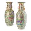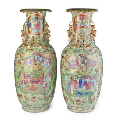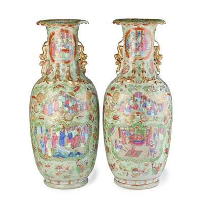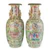 LARGE PAIR OF CELADON-GROUND CANTON FAMILLE ROSE BALUSTER VASES