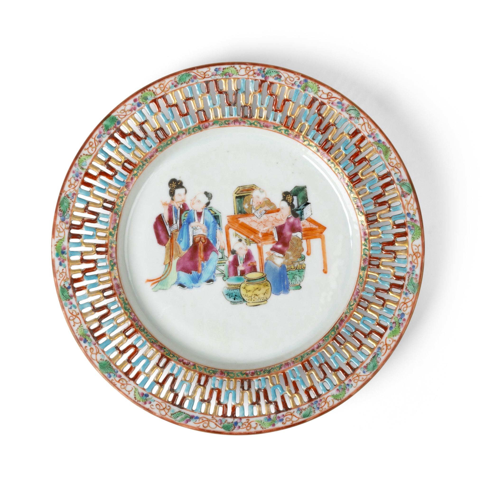 painted on the central medallion with a family scene engaging in leisure activities, the cavetto pierced and colourfully enamelled