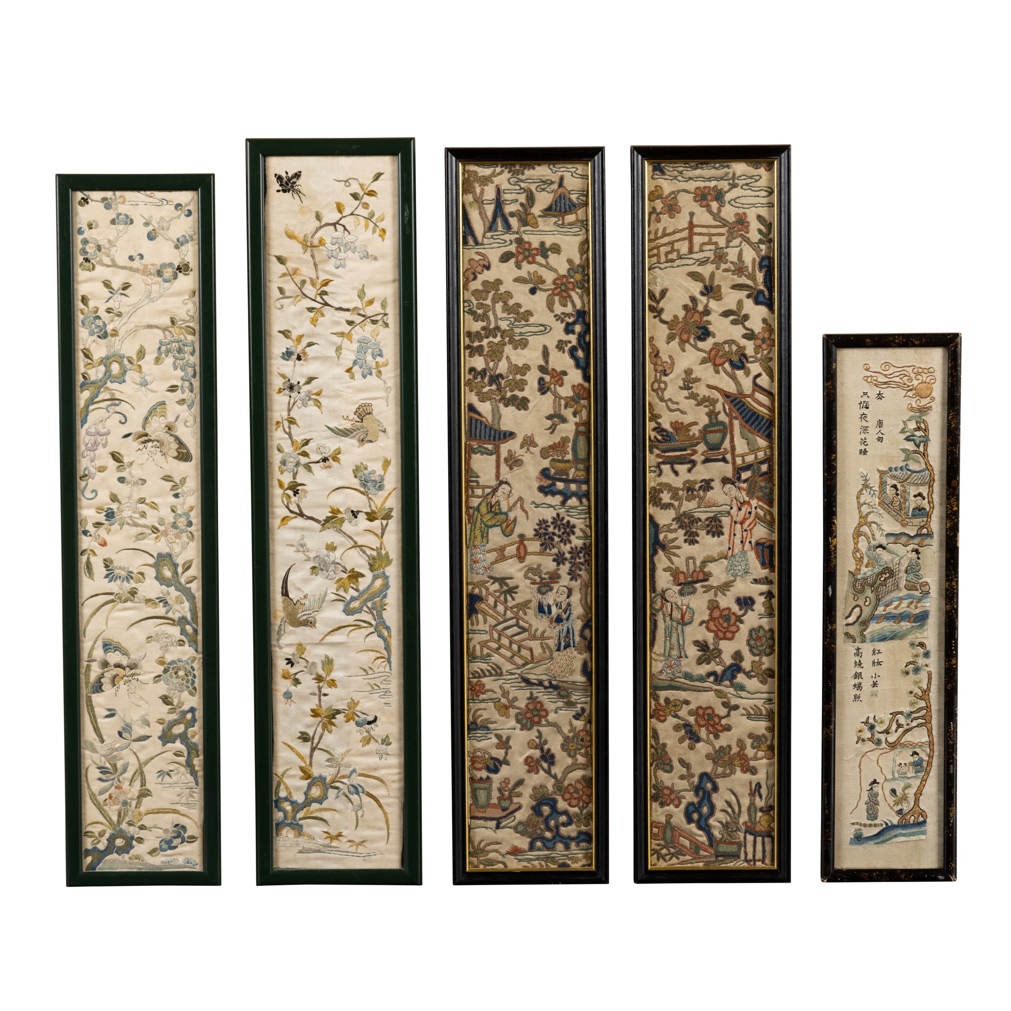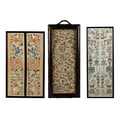 comprising: a pair of bogu motif on baby blue ground, a pair embroidered with figures in a courtyard on a beige brocade ground, each pair stitched together presented in two frames; a pair with floral motif with central flowers in Peking knot, presented together in a frame separated by a black border; a near pair with figures in courtyards with large vases and flower baskets, two depicting flowers and birds, the smallest with figures and inscriptions, each separately framed