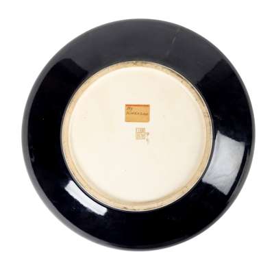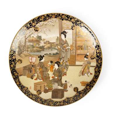 finely painted with beauties unboxing and displaying dolls for the Hinamatsuri, the rim with a border decorated with gilt blossoms reserved on a black ground, signed in red enamel Ikko ga (painted by Ikko), the underside with impressed and gilded seals Kinkozan zo (made by Kinkozan)