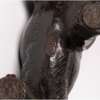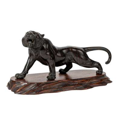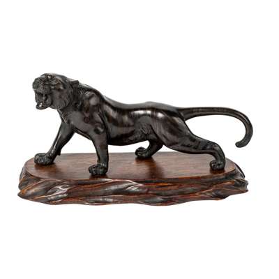 cast striding forward with its tail stretching out and curling downwards on the tip, the stripes delineated in subtly toned patination and texture, marked on its belly in a rectangular reserve 'Seiya saku', on a wooden stand