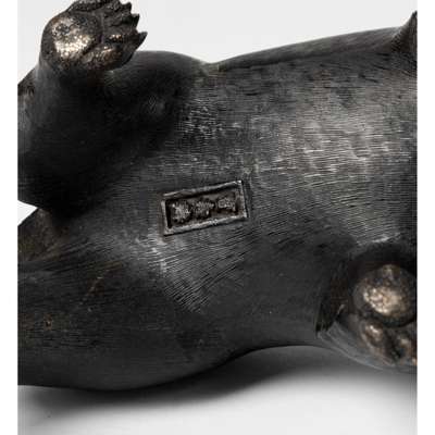 cast as a racoon dog standing on all fours in a naturalistic pose, chiselled in fine detail throughout as fur, cast with 'Hoju chu' on the belly in a rectangular recessed panel