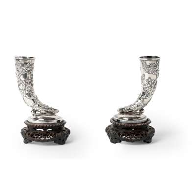each of libation cup form, the exterior decorated with prunus in relief, set on a slightly domed podium and inset to a carved wooden base, wall of the foot hallmarked 'CW', together impressed with a Chinese character 'Rui' mark