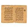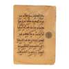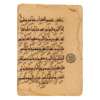Note: The style of script of this Qur’an section epitomises the transitional period from the early kufic style into the more angular and more accentuated regional styles called ‘eastern’ and ‘western’. The crossed and perfectly symmetrical lam-alif is a characteristic of the eastern kufic. Another interesting feature of this Qur’an is the structure of the thick, buff paper, whose chain lines and laid lines are clearly visible. A single folio from the same Qur’an (Sura II, al-Baqara, v.146-150) previously in the collection of Adrienne Minassian, New York, 1955, was sold Sotheby’s, London, Stuart Cary Welch Collection Part II, 6 April 2011, lot 13.