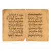 Arabic manuscript on buff paper, with 7ll of black Eastern Kufic script with red diacritics, interlinear translations in Persian script, verses separated by gold and red dotted florets, further text divisions marked by gold and polychrome marginal medallions and further drop-shaped oblong cartouches