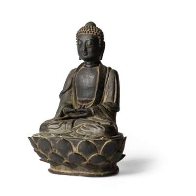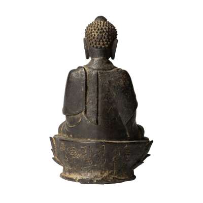 cast seated in dhyanasana on a lotus throne, hands in dhyana mudra, wears a robe with floral hems falling in naturalistic folds around the arms and legs and open at the chest, the face has a serene expression with eyes downcast, with elongated ears, the hair is dressed in curls surrounding the ushnisha, the back of the lotus throne engraved with twelve characters, meaning 'October of the first year during the Wanli reign, (donated by) Guo Puke (and) Liu Miaolian'