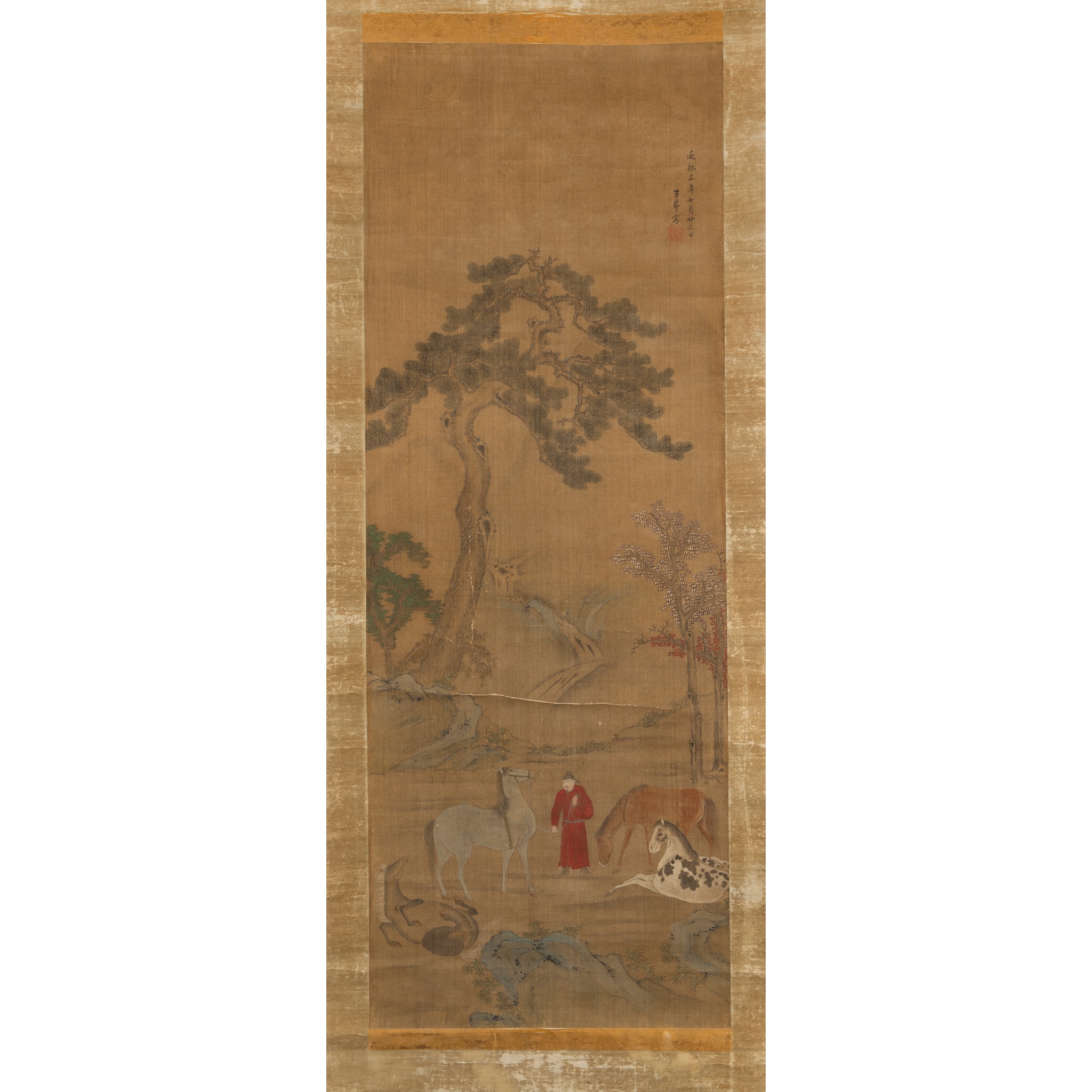 ink and colour on silk, painted with four horses and a groom underneath a towering pine tree, dated on the top right margin to the 23rd July, third Yan You reign year, corresponding to 1316AD, signed 'Zi Ang', sealed, mounted as a hanging scroll