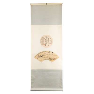 comprising: a circular calligraphy on gold splashed paper, the middle section written in bronze inscription font after a 20-character inscription on a Western-Zhou dynasty bronze 'Xue Guo plate', together with a fan-shaped painting depicting two cranes perching on a large rock beside a blossoming plum tree, both signed and sealed, two mounted as one hanging scroll