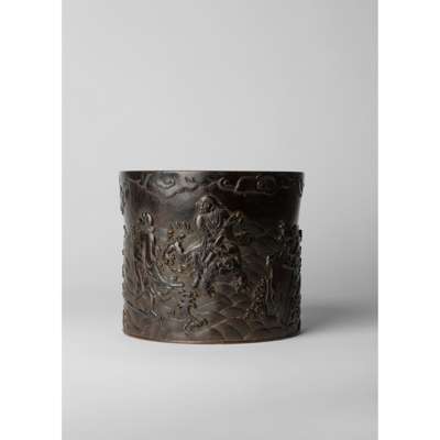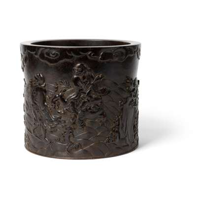 the exterior of the cylindrical body finely carved in low relief with Daoist immortals crossing swirling waves