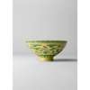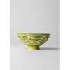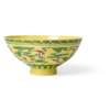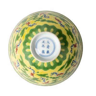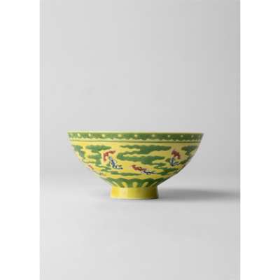 This bowl, decorated in a highly complex variation of the green-and-yellow colour scheme, represents a rare innovation introduced in the Yongzheng reign (1723-35) and not continued beyond this period. The design, referred to in the imperial archives as ‘a new category of wucai', is basically a sancai (‘three colour’) pattern in green, yellow and white, but the elements that had remained white – the bats and the ribbons – are overpainted in red and blue, respectively, and the pale green gourds have been given brown spots. Since the white areas were emphasised by application of white slip, the iron-red pigment there takes on a pinkish hue, so that this type of bowl is often mistakenly described as belonging to the famille rose.
