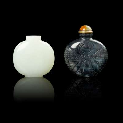 清 白玉素面 及 黑白玉雕包袱紋鼻煙壺(共兩件)