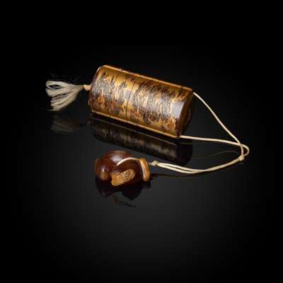 cleverly carved with three jujube dates attached with two peanuts, WITH A JAPANESE INRO, Meiji Period, both sides decorated with cranes flying amidst clouds, interior with nashiji