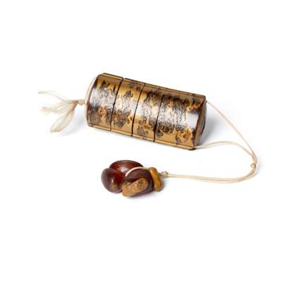 清 瑪瑙雕早生貴子擺件 帶 日本金漆雲鶴圖四層印籠