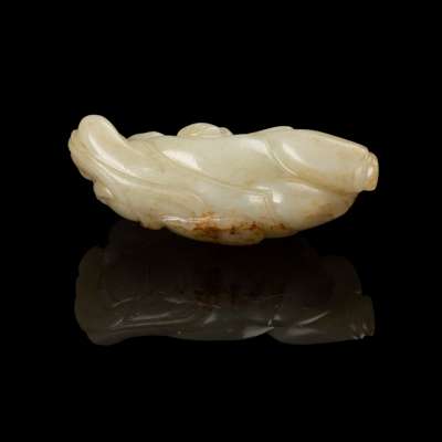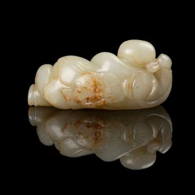the boy resting on his belly with his legs crossed and arms outstretched as if in flight, his right hand raised and holding lotus and leaf extending on his back, his head finely detailed with almond-shaped eyes and smiling face, the stone of even pale green tone with some russet inclusions