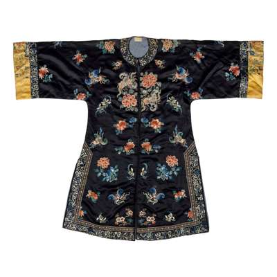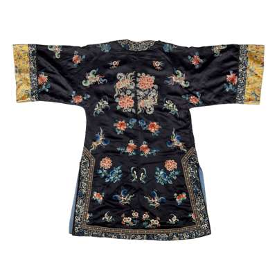 with long and wide sleeves, embroidered on a navy silk ground with butterflies and flowers