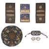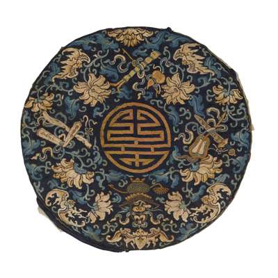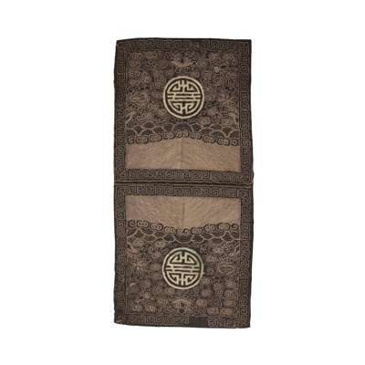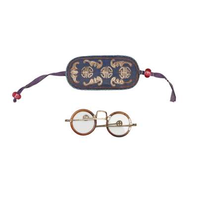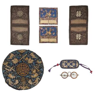 comprising: a set of 'quail' embroidered rank badges; a set of badges with 'shou' roundels; a set of badges with Shuang Xi- Double Happiness; a roundel decorated with auspicious symbols enclosing a 'shou' roundels; a pouch embroidered with bats and shou roundels TOGETHER WITH A PAIR OF GLASSES with tortoiseshell frames