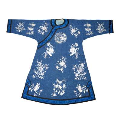 with tapered sleeves, the dark-blue silk damask featuring cranes amidst gourds borne on scrolling foliage, embroidered in white with coiling dragon and phoenix, further with floral sprays, hemmed with blue embroidery