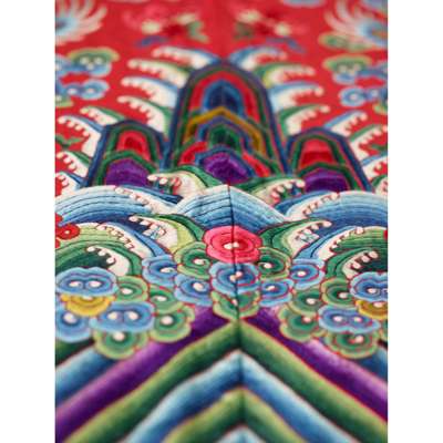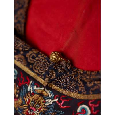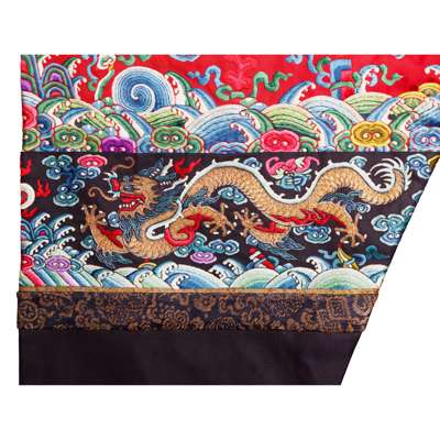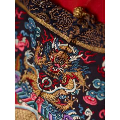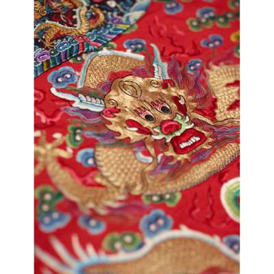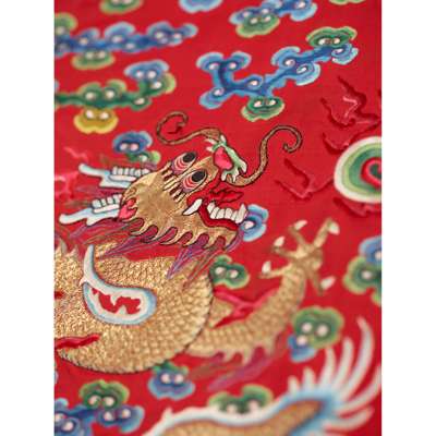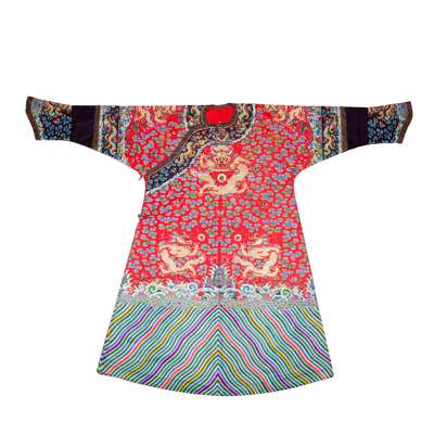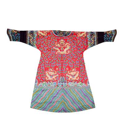 Note: Compare to a red-ground 'dragon' robe, jifu, Qing dynasty, 19th century, further with shou and other auspicious symbols, sold at Sotheby's Paris, 10 June 2021, lot 180; Also see a red-ground silk-court robe, jifu, early 20th century, sold at Christie's London, 19 Jul 2018, lot 309.
