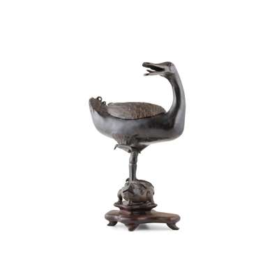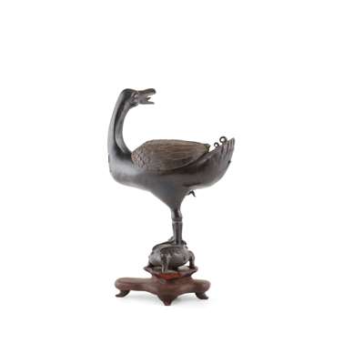 Note: Bronze incense burner in the form of a goose or duck, either standing one-legged or two, is a relatively common subject matter. The three-legged toad, known as jinchan in Chinese, is a beloved mythical animal believed to beckon wealth, usually depicted with the immortal Liu Hai. However, it is unusual to see the combination of a duck standing on a toad. A comparable example, dated to the Ming dynasty, is in the Guanfu Museum, note the similarity of the composition of the duck and toad. According to the museum note, 'duck', in Chinese ya, is a homophonic pun for 'press' or 'insistence', and the toad symbolises wealth. The duck standing sideway on the toad implies a guaranteed unexpected, or sudden gain of wealth.