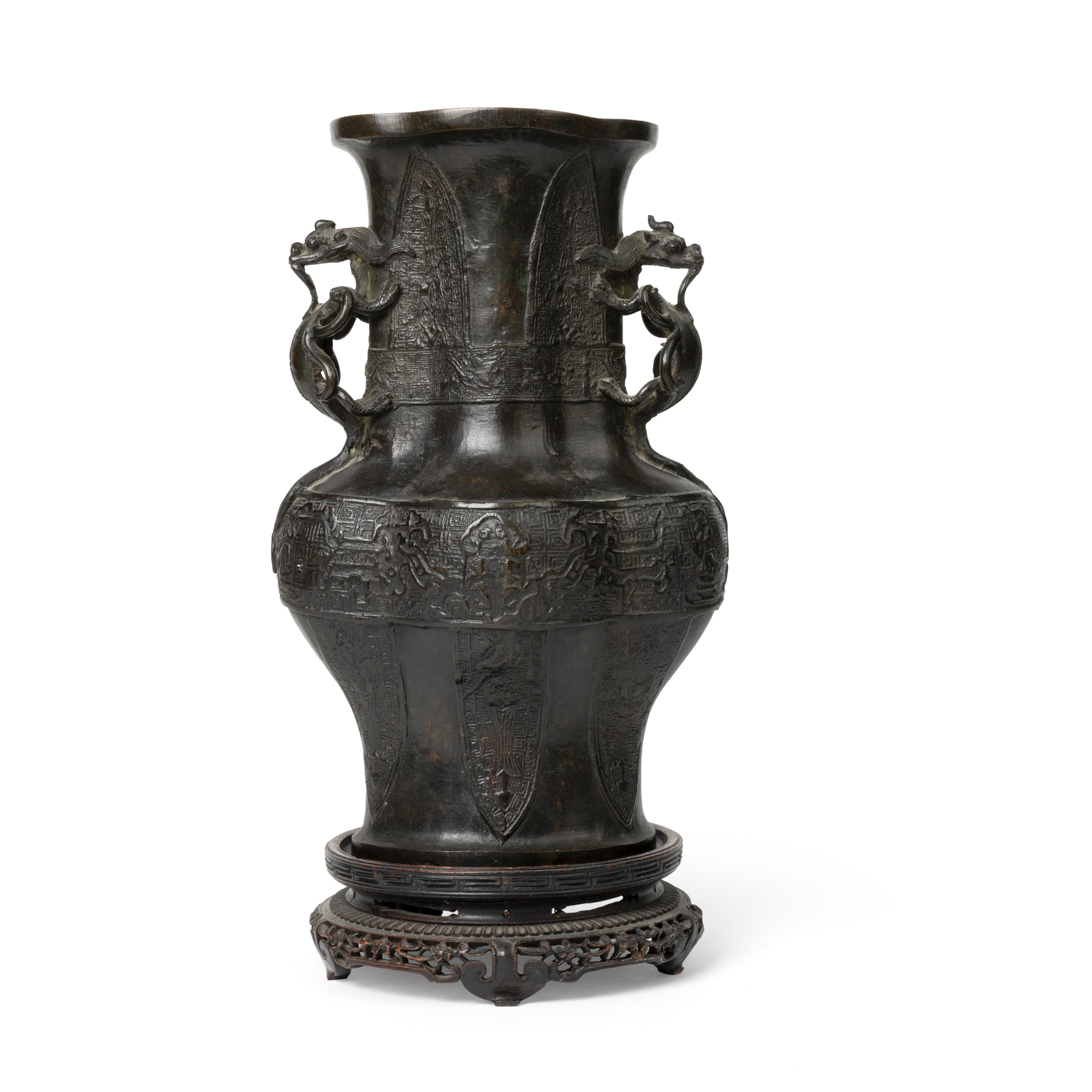 the quatrelobed body cast in low relief with two bands of confronting and addorsed kui dragons reserved against a dense leiwen ground, below a band of six cicada lappets, the neck flanked by a pair of chi dragons, the base with moulded net pattern, with a circular wooden base