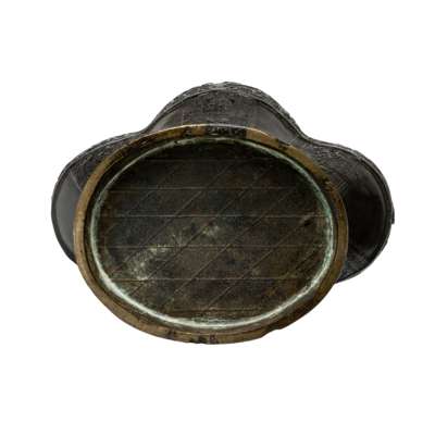 明 銅仿古饕餮紋螭龍耳海棠型壺 帶木座