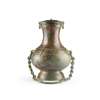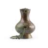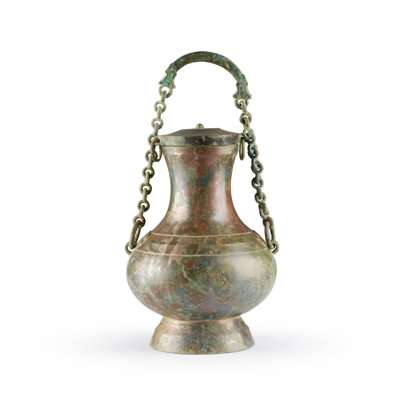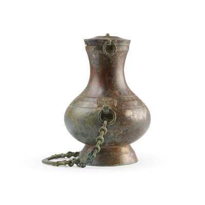 the pear-shaped vessel rising from a flaring foot to a waisted neck and slightly everting mouth, the shoulders encircled by a wide band with a ridge cast in relief, further flanked by a pair of taotie masks suspending loose rings carrying a chained loop handle, the cover with two suspended rings, a small knob finial