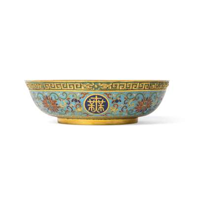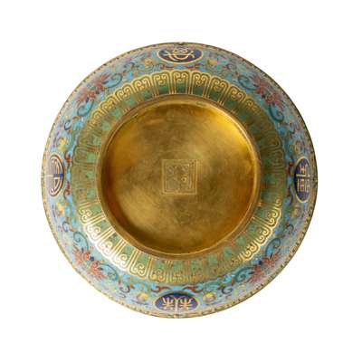 Note: According to Qing court records, in the 45th year of the Qianlong reign (1780), a large number of cloisonné enamel bowls and dishes decorated with wanshou wujiang characters were produced for the celebration of the Emperor's 70th birthday. Some similar plates are in the collection of the National Palace Muesum, Taipei, museum number Zhong Fa 中琺199, 201, 203 etc.