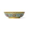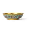 heavily cast, the exterior decorated with four circular medallions enclosing the characters, 'wan shou wu jiang (ten thousand years of long life without end)', all surrounded by lotus scroll between yellow-green champlevé enamel borders of archaistic dragon scroll above and petal lappets below, the interior, foot and base heavily gilded, the base inscribed with a four-character mark reading 'zi sun yong bao (treasured forever by sons and grandsons)' within a double square