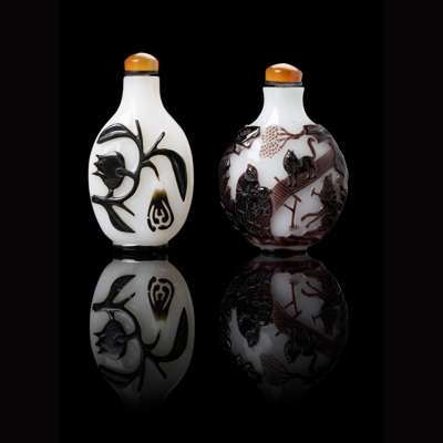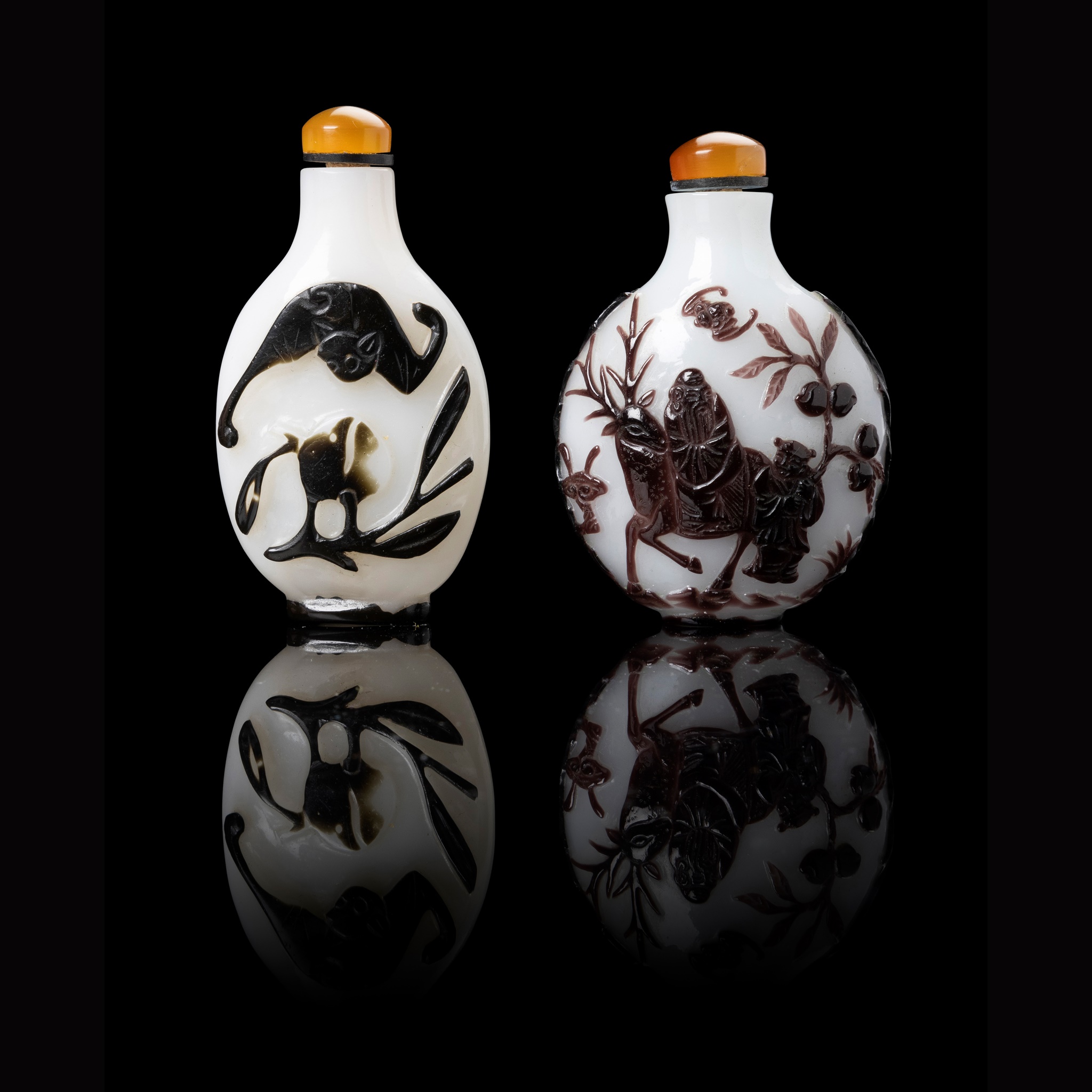 one purple-overlay white glass 'immortal riding deer' snuff bottle, and one black-overlay white glass 'bat and sanduo' snuff bottle, both with stoppers